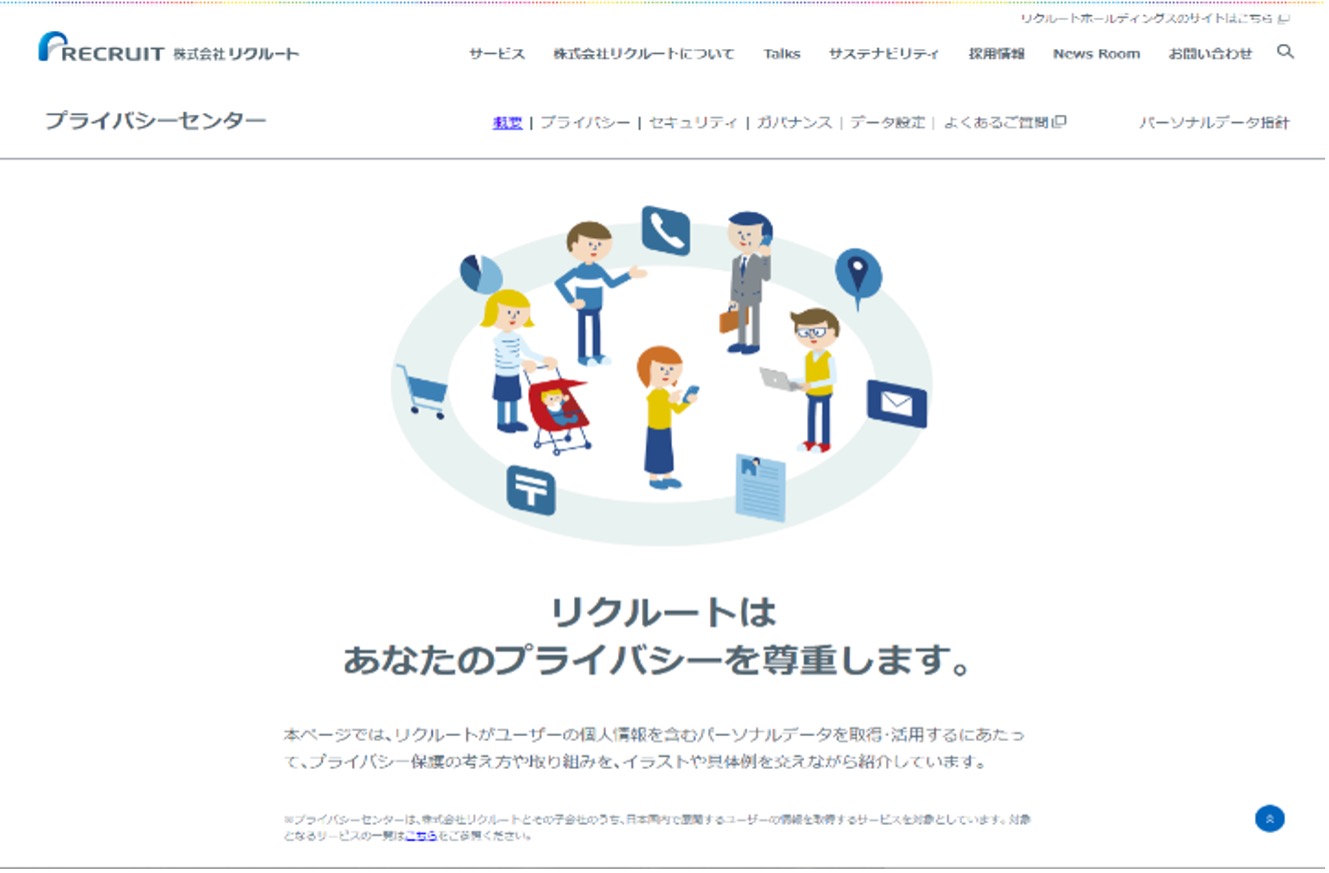 株式会社リクルートは、2019年8月にサービスを廃止した『リクナビDMPフォロー』をめぐる問題で、個人情報保護委員会などから一連の勧告・指導を受けました。その後、社外から第三者を交えた検証や再発防止の検討を行い、2020年4月に「パーソナルデータ指針」を公開し、プライバシーに関する評価・審議を行う専門組織を設置するなど、プライバシーに対する取り組みを強化しています。